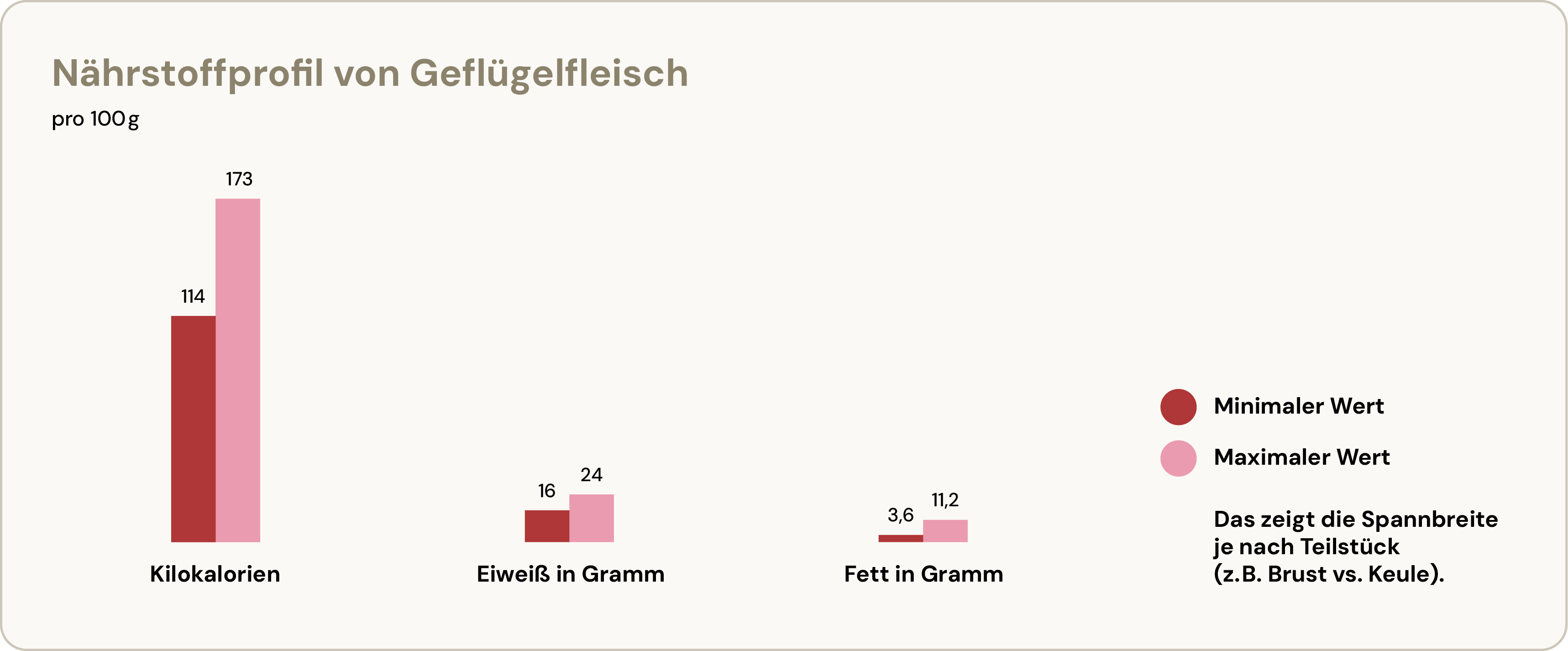Geflügelfleisch beinhaltet viel hochwertiges Eiweiß – etwa 16 bis 24 Gramm pro 100 Gramm, je nach Teilstück. Gleichzeitig enthält es 114 bis 173 Kilokalorien und zwischen 3,6 und 11,2 Gramm Fett. Ein Großteil davon sind ungesättigte Fettsäuren. Hautloses Geflügelfleisch enthält nahezu keine Kohlenhydrate.